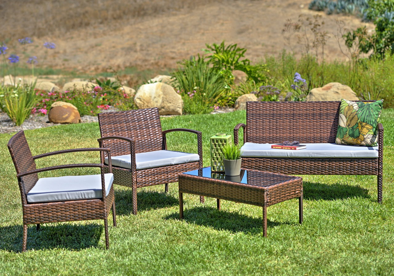 Juego de Terraza Living de Mimbre Sintético Belofonte Sofá + Sitiales + Mesa Centro Cafe Oscuro